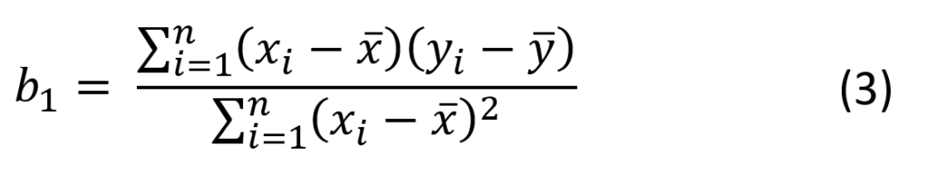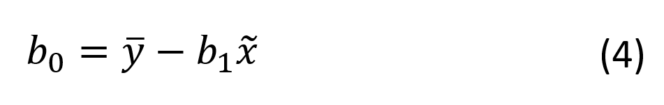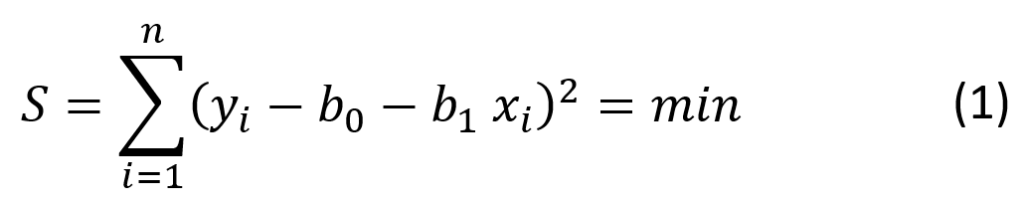 Metoda najmniejszych kwadratów polega na takim wyznaczeniu wartości estymatorów b1 i b0, aby suma S osiągnęła minimum. Estymując współczynniki regresji b1 (współczynnik kierunkowy) oraz b0 (rzędna początkowa) otrzymuje się równanie: