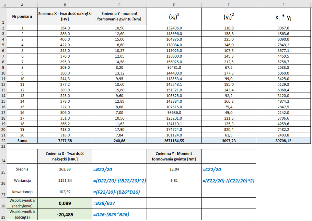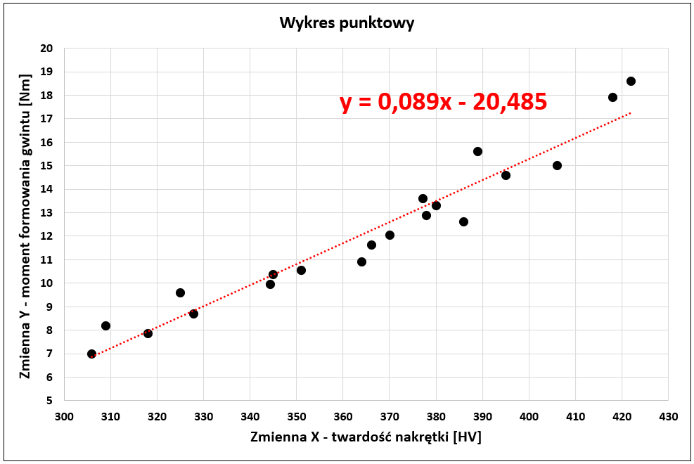 Do obliczeń wykorzystano dane z regulacji procesu dokręcania łącznika gwintowego, gdzie zmienna X (twardość nakrętki stalowej) w sposób istotny wpływała na zmienną Y (moment formowania gwintu w technologii Taptite).