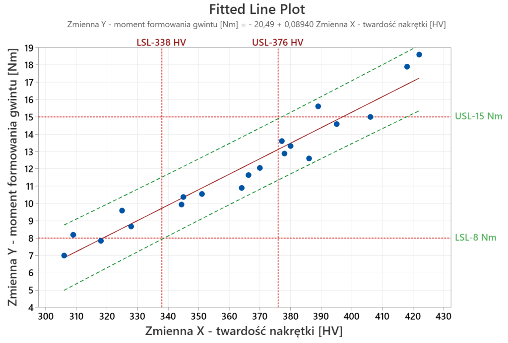 Dodatnia wartość współczynnika nachylenia (0,089) oraz kierunek nachylenia linii regresji wskazuje na korelację dodatnią, co oznacza, że wraz ze wzrostem twardości nakrętki stalowej (zmienna X) zwiększa się wartość momentu formownia gwintu (zmienna Y).